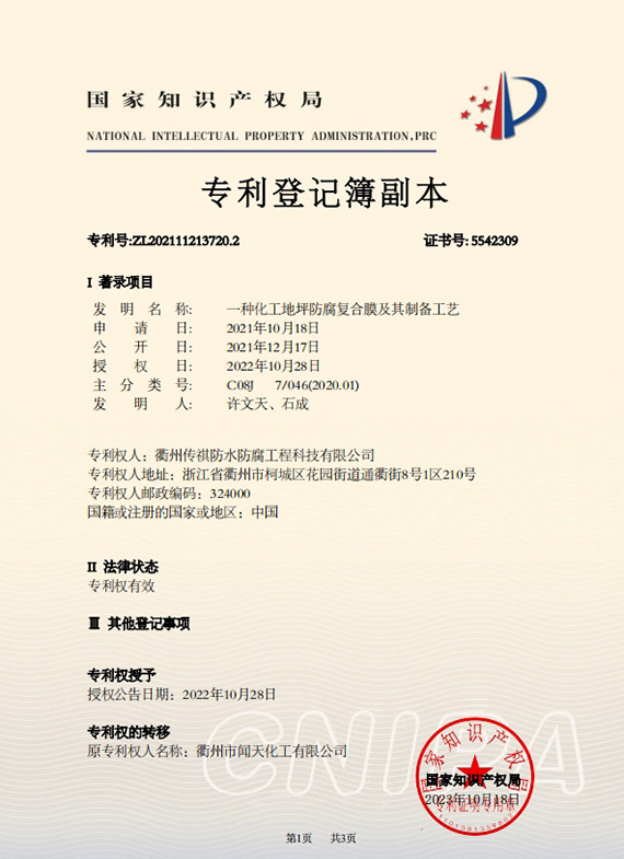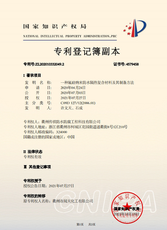 衢州傳祺新材料科技有限公司是衢州市聞天化工有限公司的下屬企業(yè);衢州市聞天化工有限公司成立于2003年,是國內(nèi)最早研發(fā)、生產(chǎn)氟碳涂料的企業(yè)之一。衢州傳祺新材料科技有限公司成立于2017年,公司專注于高分子氟材料的開發(fā)和含氟材料在防腐、防水領域的應用。經(jīng)過6年的不懈努力,已獲得了化工和建筑領域六項國家發(fā)明專利授權和兩項新產(chǎn)品科技成果獎,參與了中國建筑材料流通協(xié)會《房屋修繕防水工程規(guī)范》標準的編制工作,中建協(xié)涂裝委員會浙西工作站設立在我公司。